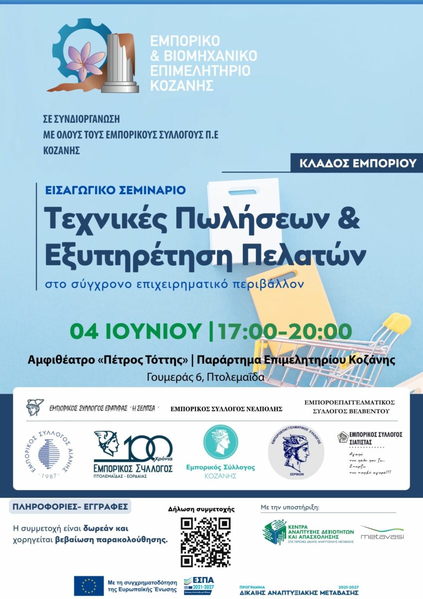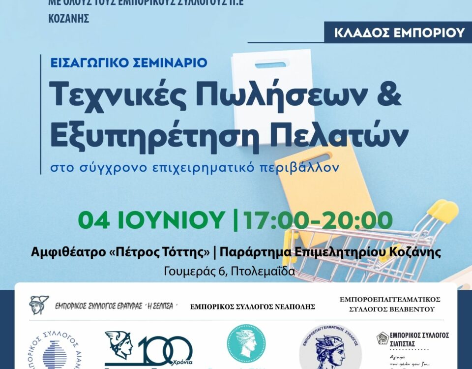 Το Επιμελητήριο Κοζάνης, σε συνδιοργάνωση με όλους τους Εμπορικούς Συλλόγους της Π.Ε. Κοζάνης, διοργανώνει εισαγωγικό σεμινάριο με θέμα: «Τεχνικές Πωλήσεων & Εξυπηρέτηση Πελατών στο σύγχρονο επιχειρηματικό περιβάλλον».
