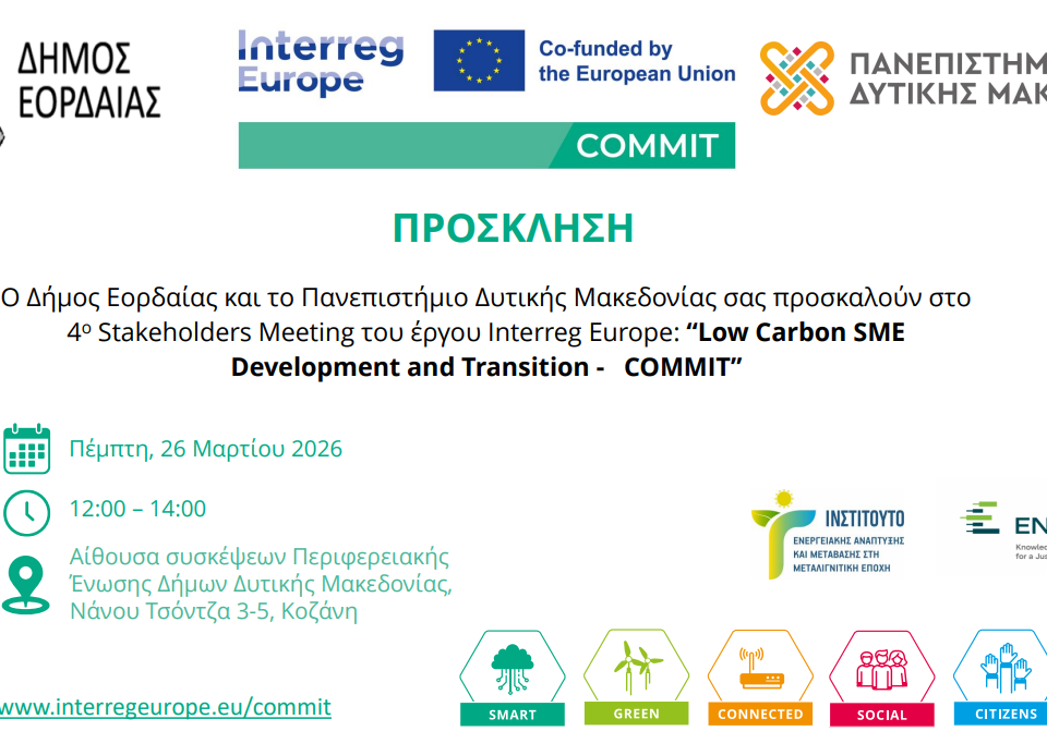 Στελέχη του Μηχανισμού Στήριξης Επιχειρήσεων θα συμμετάσχουν στο 4ο stakeholders Meeting του έργου INTERREG EUROPE "COMMIT" με θέμα "Μικρομεσαίες επιχειρήσεις: μετάβαση στην πράσινη οικονομία και ανάπτυξη".
