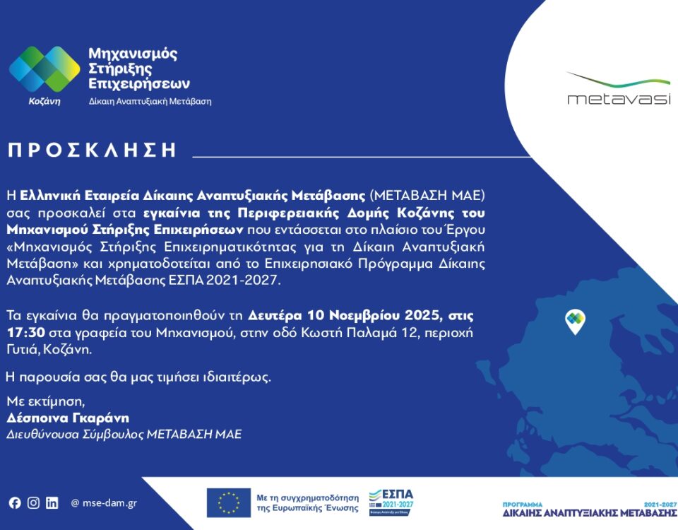Η Ελληνική Εταιρεία Δίκαιης Αναπτυξιακής Μετάβασης (ΜΕΤΑΒΑΣΗ ΜΑΕ) σας προσκαλεί στα εγκαίνια της Περιφερειακής Δομής Κοζάνης του Μηχανισμού Στήριξης Επιχειρήσεων που εντάσσεται στο πλαίσιο του Έργου «Μηχανισμός Στήριξης Επιχειρηματικότητας […]