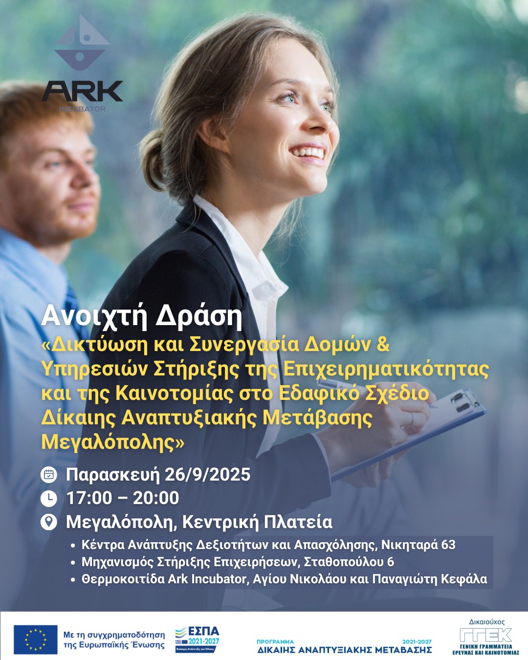 Μια πολύ ενδιαφέρουσα εκδήλωση / Ανοιχτή Δράση διοργανώνει η Θερμοκοιτίδα ARK INCUBATOR με τίτλο «Δικτύωση και Συνεργασία Δομών & Υπηρεσιών Στήριξης της Επιχειρηματικότητας και της Καινοτομίας στο Εδαφικό Σχέδιο Δίκαιης Αναπτυξιακής Μετάβασης Μεγαλόπολης», στο πλαίσιο της πράξης «Δημιουργία θερμοκοιτίδων & εκκολαπτηρίων για την ανάπτυξη της Καινοτομίας σε τομείς προτεραιότητας της Στρατηγικής Έρευνας Καινοτομίας Δίκαιης Αναπτυξιακής Μετάβαση από τη ΓΓΕΚ» που συγχρηματοδοτείται από το Πρόγραμμα «Δίκαιη Αναπτυξιακή Μετάβαση» 2021-2027 (ΠΔΑΜ).