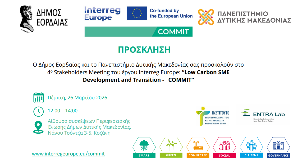 Στελέχη του Μηχανισμού Στήριξης Επιχειρήσεων θα συμμετάσχουν στο 4ο stakeholders Meeting του έργου INTERREG EUROPE "COMMIT" με θέμα "Μικρομεσαίες επιχειρήσεις: μετάβαση στην πράσινη οικονομία και ανάπτυξη".