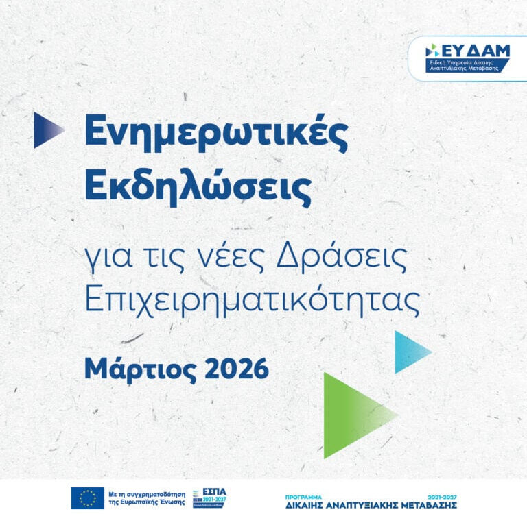 Δημοσιεύτηκαν στη Διαύγεια στις 28-11-2025 οι Τροποποιήσεις (7η) των Αναλυτικών Προσκλήσεων των Δράσεων ενίσχυσης Επιχειρηματικότητας του Προγράμματος “Δίκαιη Αναπτυξιακή Μετάβαση” ΕΣΠΑ 2021-2027 που διέπονται από το καθεστώς De minimis (Ημερομηνία απόφασης 27-11-2025/Ημερομηνία ανάρτησης στη Διαύγεια 28-11-2025).